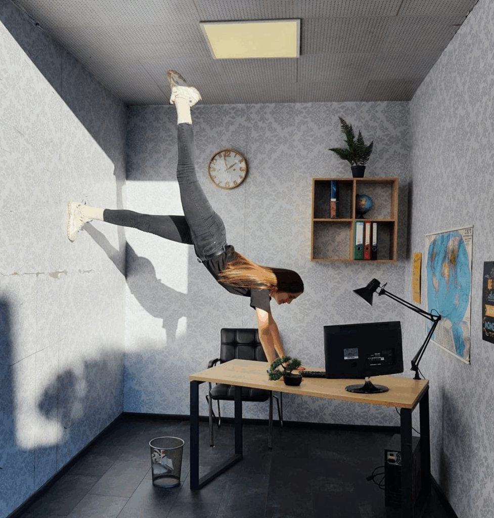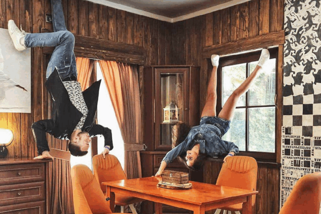 Будівля — це повноцінний двоповерховий будинок, встановлений на дах. Усе, що знаходиться всередині, також перевернуто на 180°. Предмети інтер’єру надійно закріплені, тож створюється ілюзія, ніби людина сама «ходить по стелі». Такий формат популярний у багатьох туристичних країнах, проте локація у Поляні вирізняється особливо деталізованим оформленням та продуманими фотозонами.